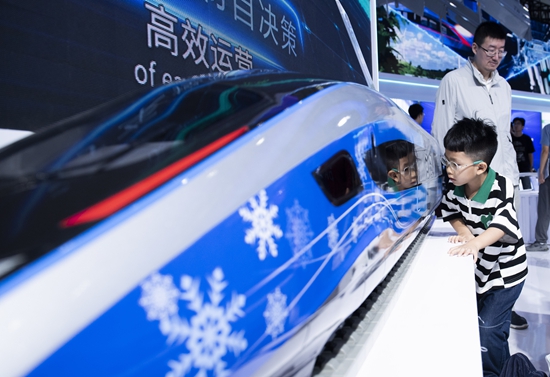 On September 21, a child observed a model of an intelligent EMU train at the 2024 World Manufacturing Convention. The event, held from September 20 to 23 in Hefei, Anhui, featured various exhibits such as straddle monorail trains, unmanned electric vertical take-off and landing aircraft and new energy vehicles. These exhibits attracted visitors, offering them a firsthand experience of new and diverse modes of transportation in the new era.