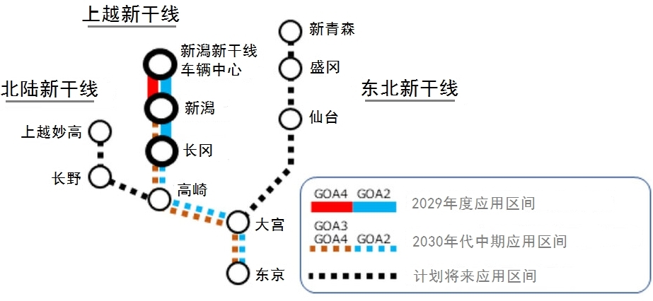 【Yahoo日本网站2024年9月报道】JR东日本公司于2024年9月10日发布了新干线自动驾驶系统的应用计划。该计划包括:2028年度,上越新干线长冈站—新潟新干线车辆中心段(长度约60.8公里)的运营列车、回送列车,应用半自动驾驶(GOA2级);2029年度,新潟站—新潟新干线车辆中心段(长度约5.1公里),应用全自动驾驶(GOA4级)。并且,2030年代中期,东京站—长冈站段的营业列车和回送列车应用半自动驾驶(GOA2级);东京站—新潟站段营业列车应用添乘自动驾驶(GOA3级)、回送列车应用全自动驾驶(GOA4级)。