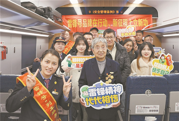 3月5日,“雷锋号”列车上迎来一位特殊旅客。全国劳动模范、“雷锋号”列车第一代列车员王汉云在列车上向乘务员和旅客宣讲雷锋精神。