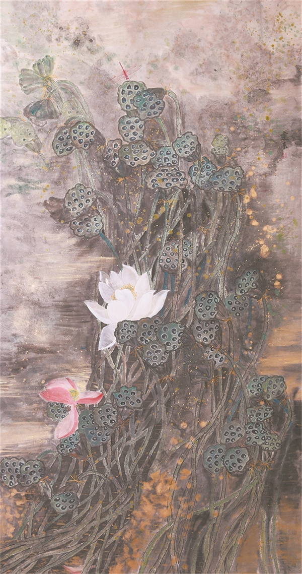 在2023年入选“中国梦·劳动美”全国职工书画展的作品《野趣》中,他用焦墨皴擦出山岩的嶙峋,以淡彩点染轨旁丛生的野菊,画面一角隐约可见一列动车组穿隧而过,动静相生间,工业与自然达成微妙平衡。另一幅《金色池塘》则聚焦铁路沿线风光,秋日余晖洒在水塘上,塘中荷叶摇曳生姿,他将铁路沿线风景描绘得栩栩如生。