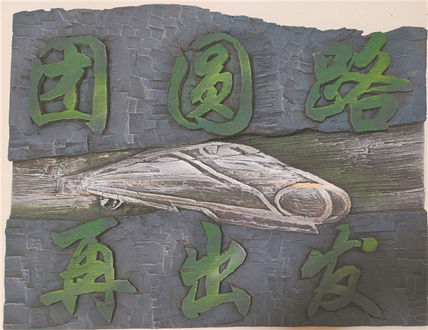 2010年,他的篆刻作品《古道故国》以秦代“车同轨”为灵感,将古驿道与高铁轨道意象熔于一炉,在第八届全国现代刻字艺术展上引发关注,最终被上海美术馆永久收藏。次年,作品《吴越同舟》在第二届国际刻字大赛斩获殊荣,其以苍劲刀痕勾勒车厢轮廓,车厢内以细线雕出山水纹样,寓意“人在旅途,心寄山河”。