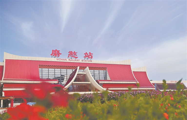 故事:中老铁路国际旅客列车开行两周年之际,为中老铁路磨憨口岸站留影,车站在晴空下像一幅绚丽多彩的画卷