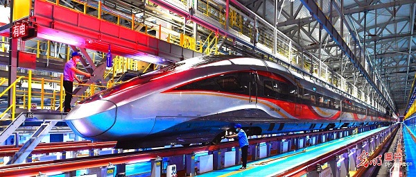 2021年10月5日凌晨,北京朝阳动车所职工对入库列车实时精准“体检”,确保节日运输安全。(孙立君摄/光明图片)