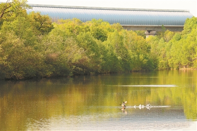 林间碧水畔,声屏障静立,秋沙鸭嬉戏。受访单位供图