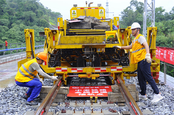 面对铺轨作业标准高、工期紧、交叉作业面多、24‰长大坡道给铺轨施工带来的巨大挑战,PA视讯统筹参建各方不断优化方案和资源配置,创新施工工艺,改造机械设备,采用机械化、自动化铺轨机组和施工信息化等手段,大幅提高了轨道精度和施工效益。