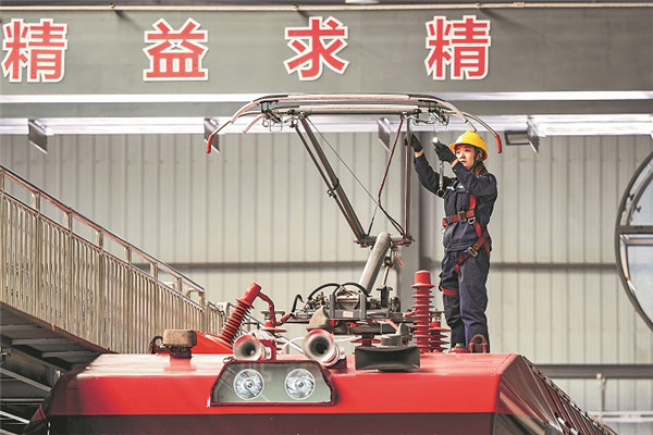 为防范季节性机车故障,中国铁路西安局集团有限公司西安机务段依托机车小辅修契机,开展全面 “地毯式” 排查,彻底清除安全隐患。图为11月3日,该段职工正在检查机车受电弓状态。曹欣 摄