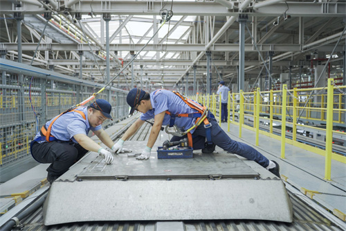 烈日下,检修库内温度超40℃,虽然有工业吊扇缓解热量,但工作中的“清肺师”们不断拆卸、安装空调盖板……一套动作下来,“清肺师”们头发湿得能滴水,工作服也一直黏在身上,已是汗流浃背了,要把空调盖板安装得严丝合缝,需要耗费很多体能。“一块空调裙板最重有30公斤,需要双人合作才能拆卸下,这对体力也是很大的考验。”正在进行空调裙板安装的曾雨森感慨道。
