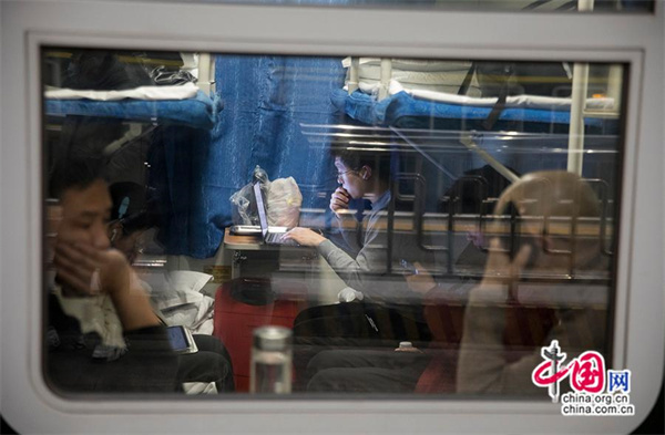 踏上归乡的乘客仍不忘处理遗留的“手头作业”。中国网记者 马旷/摄