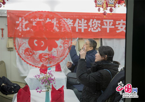 K4159次列车的餐车布置年味十足,引得旅客拍照打卡。中国网记者 马旷/摄