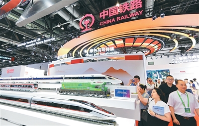 观众在第十二届世界高铁大会同期举办的中国国际现代化铁路技术装备展览会上参观中国铁路装备。唐 克摄(人民视觉)