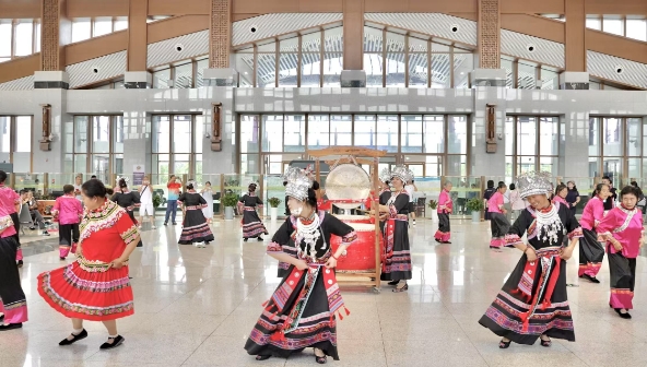 6月18日11时,在渝厦高铁黔常段龙山北站的候车大厅里,一群身着土家族盛装的表演者从旅客中奔跑而出,激昂的鼓点响起,与响亮的锣声交替,奏出铿锵鼓点乐声。头戴银饰的土家姑娘巧笑倩兮,阿婆阿公精神抖擞,踏着鼓点节拍,甩动双臂,旋转跳跃。一场气势磅礴的摆手舞在龙山北站候车大厅快闪,瞬间成为焦点,引得候车旅客纷纷驻足观看。