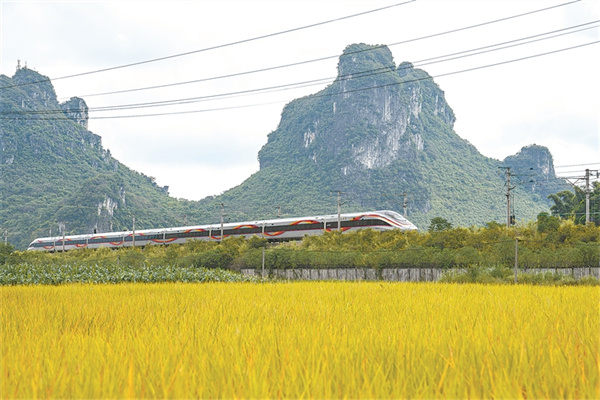 连日来,中国铁路南宁局集团有限公司科学安排运力,优化列车开行方案,对热门方向补充运力,为旅客出行提供保障。图为近日,一列复兴号动车组列车安全行驶在柳南客专上。兰炳侣 摄