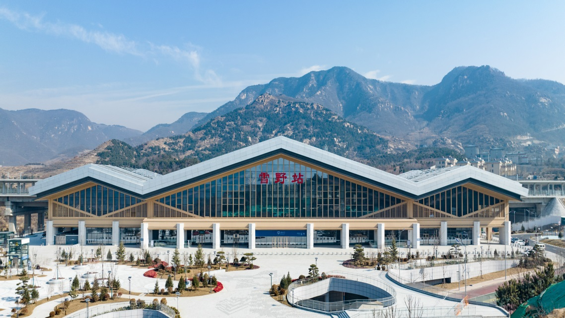 雪野站位于济南市莱芜区雪野镇,紧靠雪野湖旅游区,隶属中国铁路济南局集团有限公司,于2022年12月开通运营。站房总面积9988平方米,候车面积4800平方米。实行“验检合一、售服合一、进出合一”客运组织模式。站房主体建筑地上一层,地下一层。站房在设计上采用“日月星汉、山水雪野”的设计理念,青山掩映,绿水浮影,层层山峦倒映进波光粼粼的湖面,设计方案结合站房的功能属性与雪野片区地域特色,将站房的形态抽象为“山”字的符号,波动的屋面形成韵律感,与山峦叠嶂的自然背景巧妙地结合在一体,犹如一幅山水画卷,彰显雪野的仙境神韵。